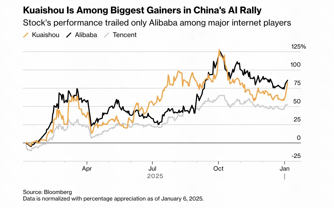 长期以来,在短视频流媒体领域,快手一直被视为字节跳动旗下TikTok的追赶者。但在过去18个月里,快手已重塑自身,并在AI生成视频领域取得了长足进步。其股价在过去一年中飙升了88%,而其AI视频生成模型“可灵”的全球潜力所引发的市场兴奋,更是在周一推动了股价再次实现两位数跃升。