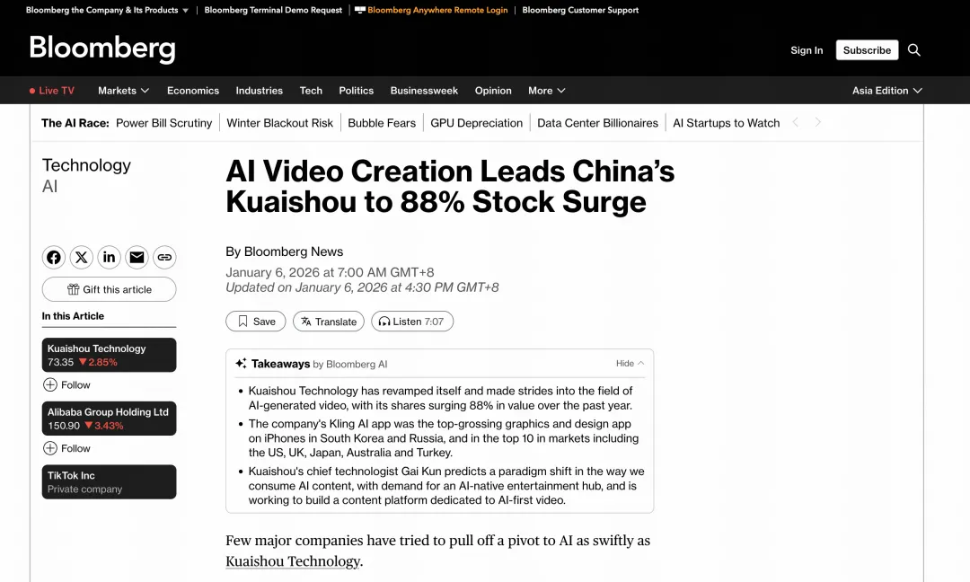 根据Sensor Tower的数据,截至1月2日,快手的可灵AI应用是韩国和俄罗斯iPhone上收入最高的图形与设计类应用,并在美国、英国、日本、澳大利亚和土耳其等市场位列前十。彭博预计,2025年可灵AI的商业收入将达到1.4亿美元。随着可灵商业化和海外化扩展的进程逐步加快,市场对快手AI布局的预期也在升温,其股价在过去一年累计上涨88%,成为中国AI相关公司中备受关注的标的之一。