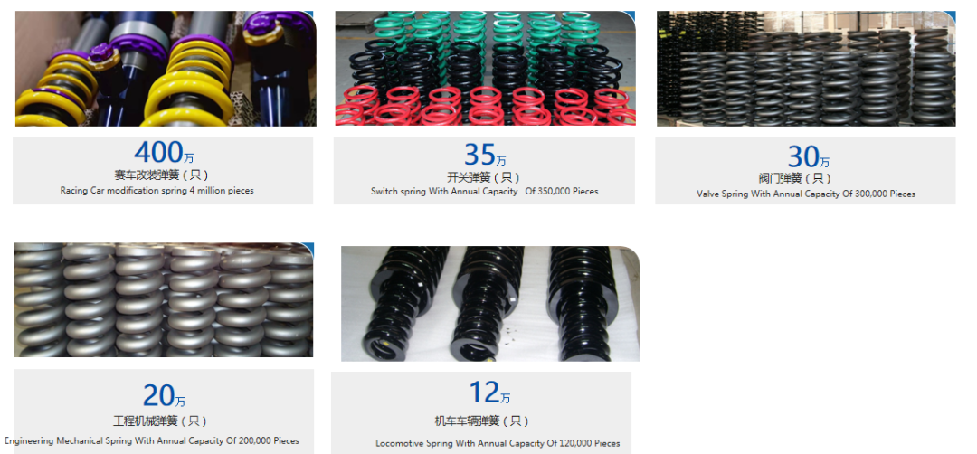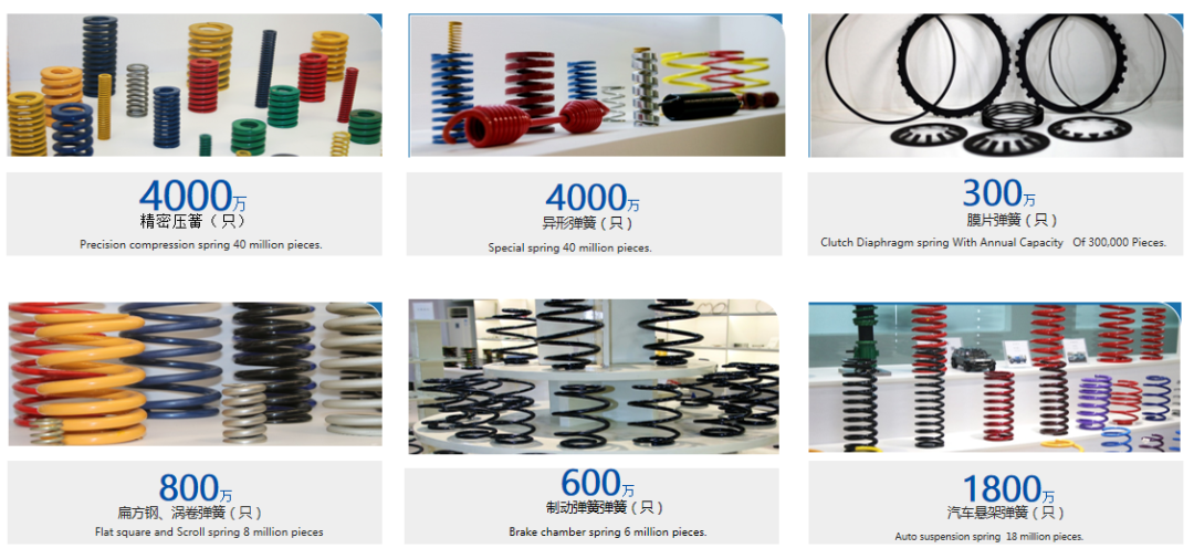 主导产品分为6大类:1、乘用车悬架弹簧,配套客户有上汽通用五菱,赛力斯(601127)汽车,长城汽车(601633),北汽股份等。2、赛车改装弹簧,配套客户有KW,TEIN,K-MAN等。3、轨道交通弹簧,配套客户有中车集团等。4、阀门执行器弹簧,配套客户有温州速马,无锡福斯托克等。5、农业机械弹簧,配套客户有柳工(000528)集团,徐工集团等。6、高压/超高压开关弹簧,配套客户有艾默生,泰开,上海思源,西门子等。