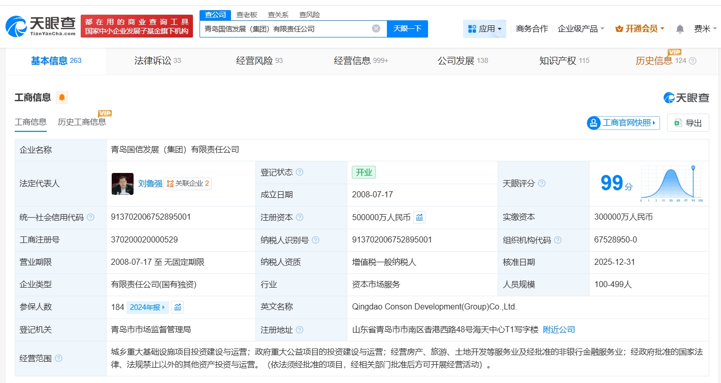 每经AI快讯,天眼查工商信息显示,近日,青岛国信发展(集团)有限责任公司发生工商变更,注册资本由30亿元人民币增至50亿元人民币,增幅约67%,同时,部分主要人员发生变更。青岛国信发展(集团)有限责任公司成立于2008年7月,法定代表人为刘鲁强,经营范围包括城乡重大基础设施项目投资建设与运营、政府重大公益项目的投资建设与运营等。股东信息显示,该公司由青岛市人民政府国有资产监督管理委员会全资持股。