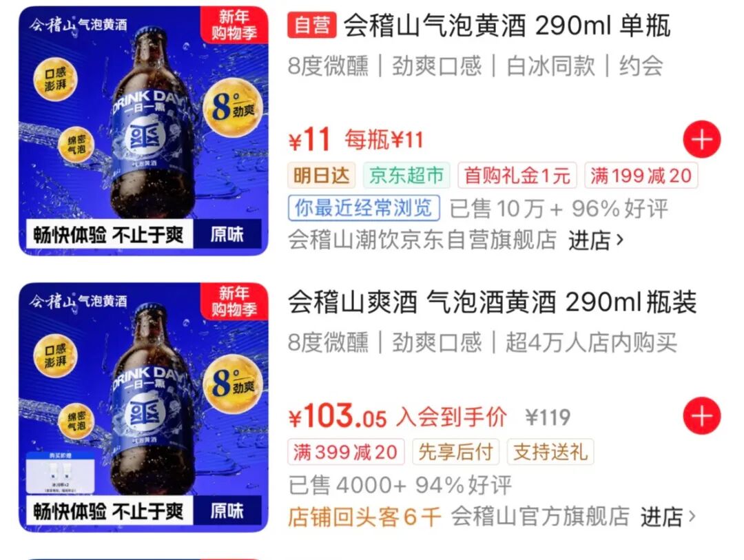 会稽山气泡黄酒于2023年年中推出,是公司年轻化战略中的重要单品,酒精度数仅8度,京东平台显示其单瓶售价为11元。上市之初产品销量平淡,直至2024年“618”期间与网红合作、在抖音直播间取得“3天销售额1000万元”的成绩才被市场知晓,甚至一度带动会稽山股价涨停,产品销售渠道也由电商平台扩大至部分区域的线下商超。