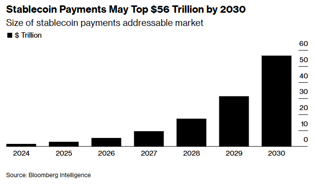 即便如此,稳定币的增长仍在加速。根据Artemis的数据,2025年第四季度的稳定币交易量达到创纪录的11万亿美元,而第三季度为 8.8万亿美元。根据分析,到2030年,稳定币支付总规模可能触及56万亿美元。