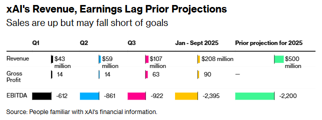 不过,xAI的亏损仍在扩大。息税折旧摊销前利润(EBITDA)仍为负值。该公司报告称,截至9月,EBITDA达到-24亿美元,表明其盈利尚不足以覆盖支出。对于初创企业而言,这并不罕见——它们通常需要大量资金来实现增长,并且需要时间才能实现盈利。但xAI的亏损规模仍超出最初预期。此前公司曾预计全年EBITDA为-22亿美元。xAI尚未向投资者披露年终业绩,但公司高管表示结果是积极的。
