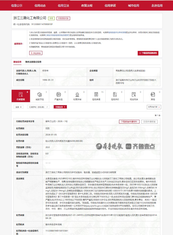 近日,齐鲁晚报·齐鲁壹点记者从信用中国获悉,浙江三晟化工有限公司(下称“浙江三晟化工”)因持排污许可证超标、超总量、逃避监管方式排放污染物案,被衢州市生态环境局罚款20万元。