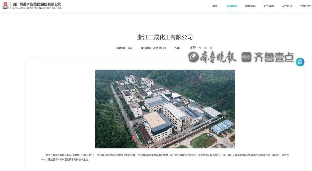 公开信息显示,浙江三晟化工成立于1996年5月31日,法定代表人为何冬林,企业位于浙江省衢州市江山市,大股东为四川蜀道矿业集团股份有限公司。2021年11月被四川路桥(600039)完成股权收购,2022年8月由新材料集团接管,是一家以从事化学原料和化学制品制造业为主,集研发、生产为一体,通过三个体系认证的国家高新技术企业。