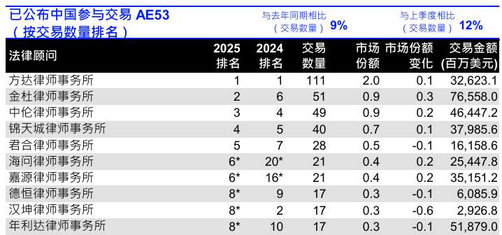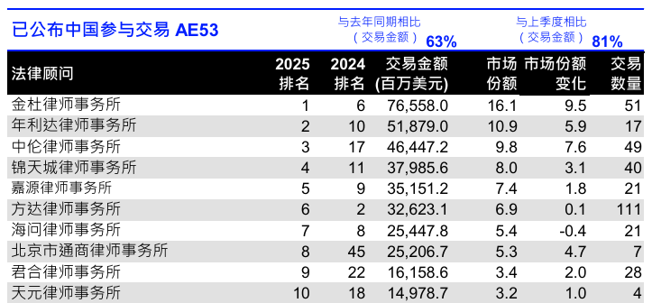 以交易金额计,2025年涉及中国内地已公布并购交易的法律顾问排名中,金杜律师事务所、年利达律师事务所及中伦律师事务所位居前三。按交易数量计,方达律师事务所、金杜律师事务所与中伦律师事务所为排名前三的法律顾问。