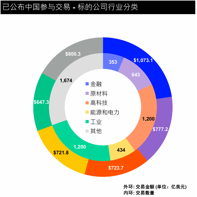涉及中国内地并购交易的标的集中在金融行业,该行业占22.62%的市场份额,交易总额达1,073亿美元,同比激增121%。原材料行业以16.39%的市场份额位居第二,同比增长158.2%。高科技行业排名第三,占15.26%的市场份额,交易金额为724亿美元,同比增长77.3%。
