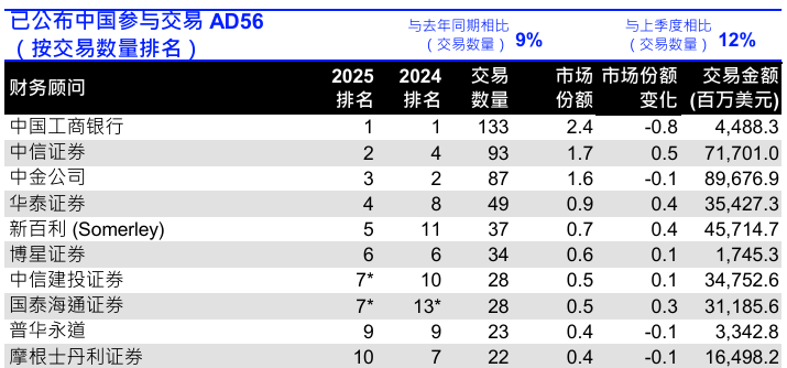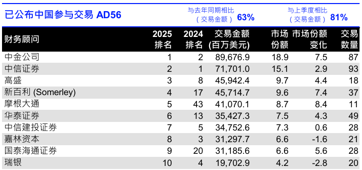 2025年,中金公司(601995)(03908)以交易金额计登顶涉及中国内地已公布并购交易的财务顾问排行榜,占18.91%的市场份额,相关交易规模达897亿美元。中信证券(600030)(06030)以15.12%的市场份额位列第二,高盛集团(GS.US)则以9.69%的份额排名第三。按交易数量计,工商银行(601398)(01398)、中信证券与中金公司位列前三。