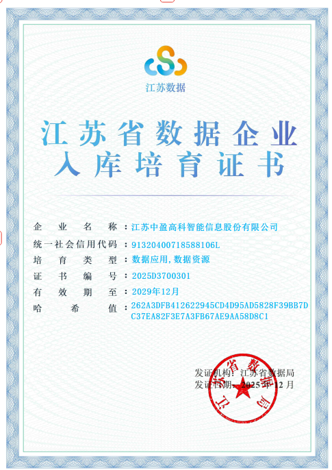 近日,江苏省数据局正式发布江苏省首批入库培育数据企业名单,江苏中盈高科智能信息股份有限公司(简称“中盈高科”)凭借在数字化建设与运营领域的深厚积累与创新实践,以“数据资源企业”和“数据应用企业”类型成功入选。