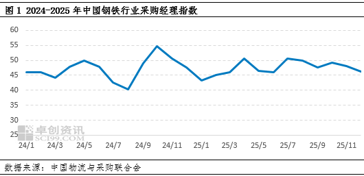 根据中国物流与采购联合会钢铁物流专业委员会最新发布的数据,2025年12月中国钢铁行业PMI为46.3%,环比下降1.7个百分点,行业景气度下滑,淡季特征显现。当下需求端持续疲软,生产活动收缩以及成本支撑减弱是造成PMI下滑的主要原因。