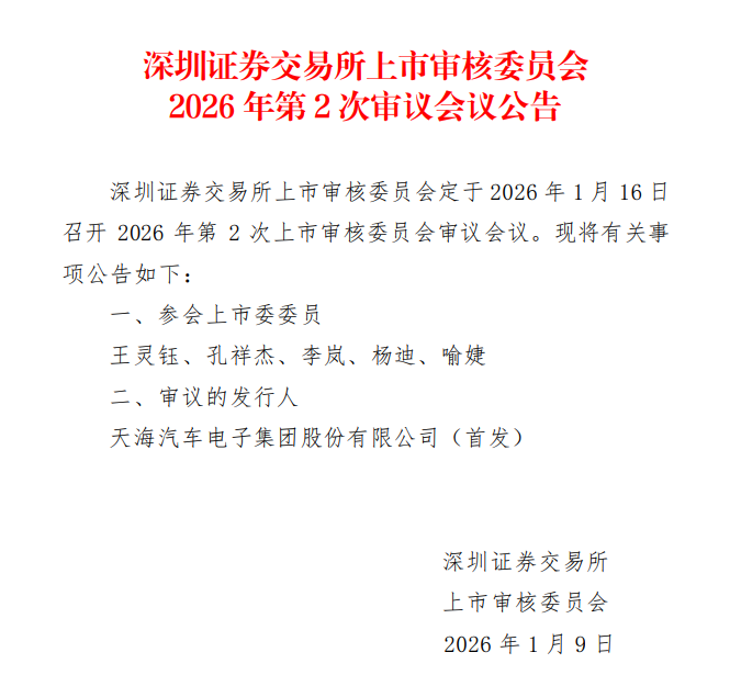 【大河财立方消息】1月9日,深交所上市委公告,定于2026年1月16日召开2026年第2次上市审核委员会审议会议,审议天海汽车电子集团股份有限公司深交所主板首发事项。