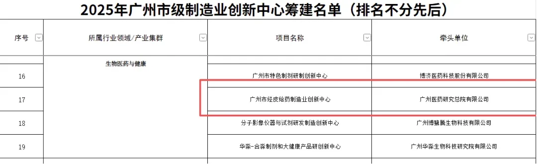 近日,广州市工业和信息化局发布《2025年广州市级制造业创新中心筹建名单》,由广州医药研究总院有限公司(以下简称“广药研究总院”)牵头申报的“广州市经皮给药制造业创新中心”成功入选,将成为广州市首批市级制造业创新中心之一。