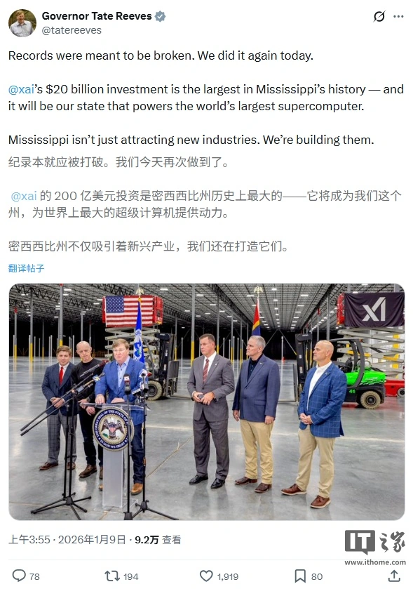 密西西比州州长泰特里夫斯在新闻稿中表示:“这项破纪录的200亿美元投资,为密西西比州经济发展注定再创辉煌的一年拉开了精彩序幕。今天,埃隆马斯克将xAI带到德索托县,这个项目将改变该地区,并为当地居民带来持续数代的巨大机遇。这是密西西比州历史上最大的经济发展项目。”