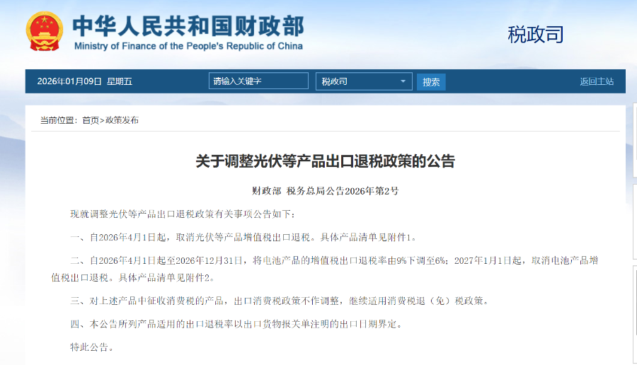 1月9日,财政部网站发布《关于调整光伏等产品出口退税政策的公告》,指出自2026年4月1日起,取消光伏等产品增值税出口退税。