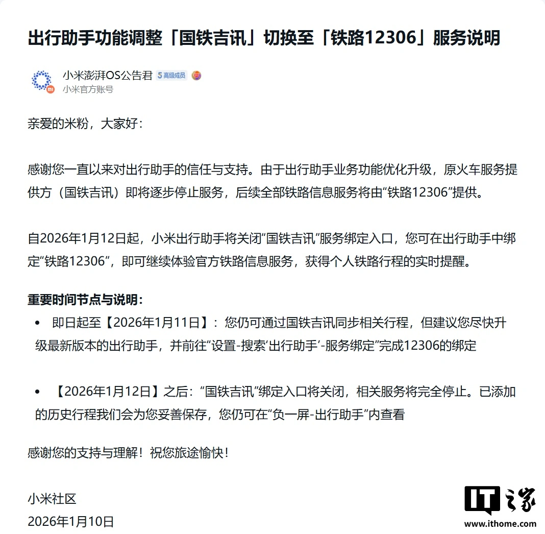 IT之家1月10日消息,小米官方今天在小米社区表示,由于澎湃OS系统出行助手业务功能优化升级,原本由国铁吉讯提供的火车服务将逐步停止服务,后续服务将由“铁路12306”提供。