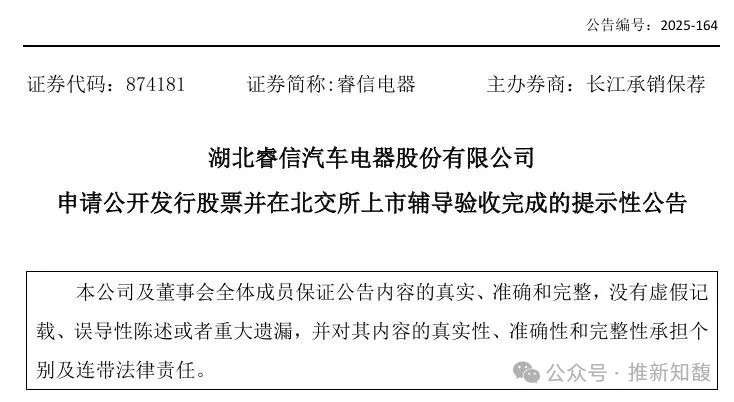 2025年12月31日,湖北睿信汽车电器股份有限公司(874181)披露招股书,公司拟在北交所上市。长江证券为公司上市保荐机构。