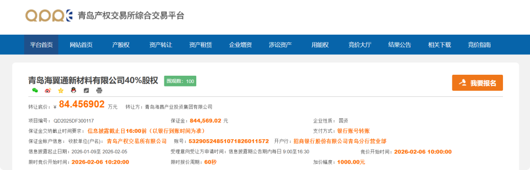 2026年1月9日,青岛产权交易所发布公告:青岛海昌产业投资集团有限公司(以下简称“海昌产业”)正式挂牌转让所持有的青岛海翼通新材料有限公司(以下简称“海翼通”)40%股权,转让底价84.456902万元。