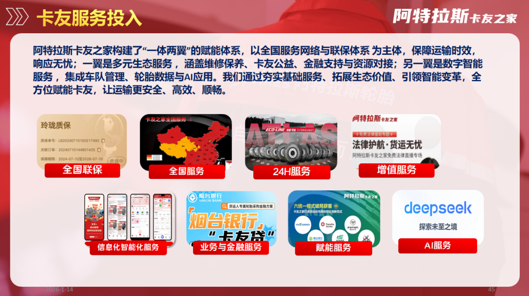 王锋董事长首先分析了行业市场形势,剖析玲珑轮胎通过“卷价值而不卷价格”的经营策略在25年取得的经营业绩增长,并重点讲解了对于阿特拉斯卡友之家的定位和未来三年规划:在新产品研发、团队人员、市场赋能、门店运营、系统开发、品牌营销、新媒体引流、司机服务等8大模块进行持续有力的投入,提供数字智能服务,集成车队管理、轮胎数据与AI应用支持为门店赋能,同时为卡友提供可靠的全国服务网络与售后联保体系、维修保养、卡友公益、卡友活动、金融支持的用户服务,实现“省心、省力、省钱”。