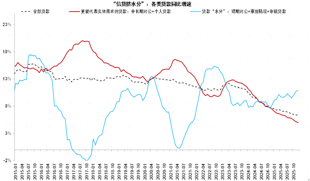 对公零售信贷需求分化。12月信贷增长呈现“对公强、居民弱”分化格局,对公信贷多增与低基数及政策性工具拉动有关,消费和地产需求偏弱背景下居民信贷维持同比少增;季节性错位导致政府债少增。具体而言: