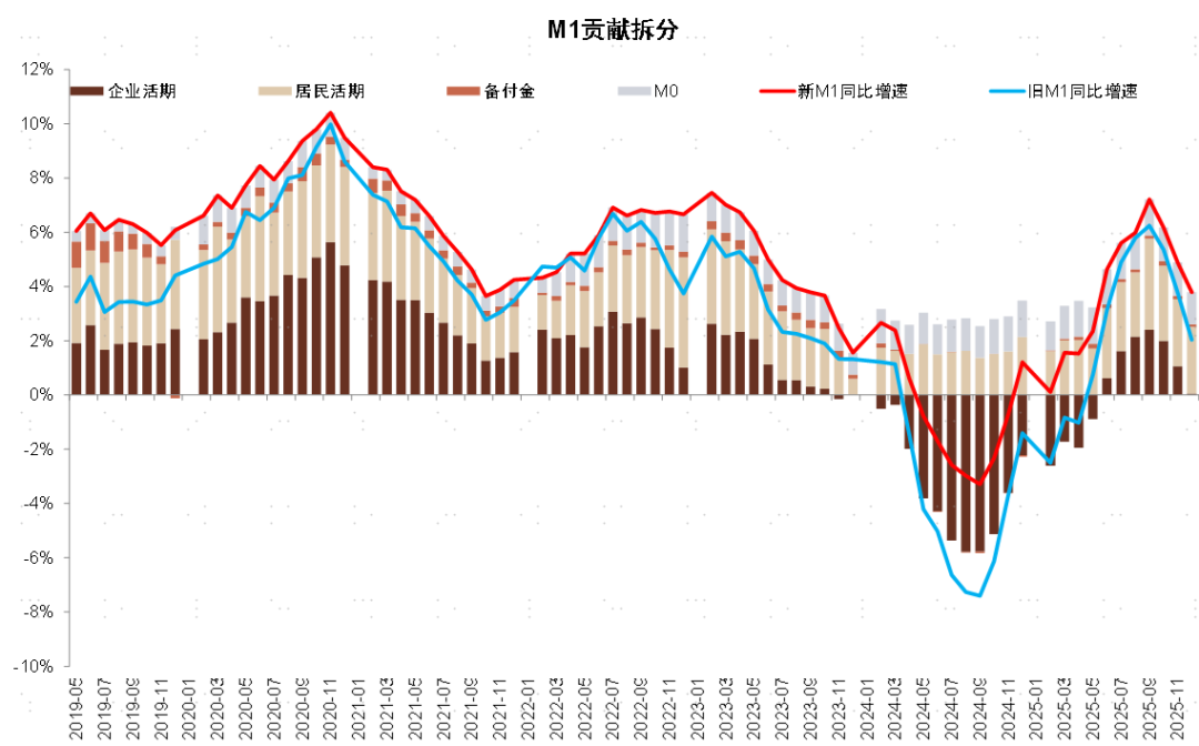 M1增速有望企稳回升。2025年12月M1同比增速回落至3.8%,主要由于2024年同期高基数影响,当时财政资金拨付、地方化债和偿还欠款等因素推高企业活期存款。今年一季度随着定期存款到期重配置,我们预计M1增速有望见底回升。