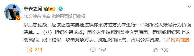 刚刚,微博CEO王高飞发文:以后想论战,应该还是需要通过媒体采访的方式来进行~~“网络名人账号行为负面清单……(八)组织约架论战。因个人争端和利益冲突等原因,策划或组织网上论战骂战、线下约架,攻击竞争对手,挑起网络戾气,占用公共资源。”