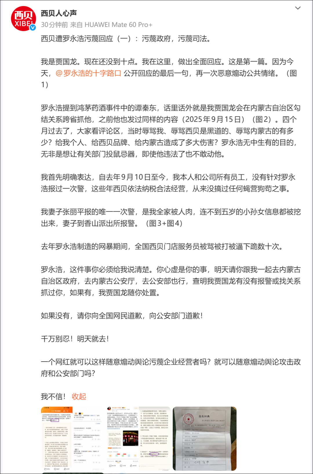 1月16日21时30分许,贾国龙通过@西贝人心声 官微发声,指称罗永浩恶意煽动公共情绪。