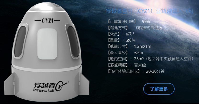 穿越者官网显示,穿越者壹号(CYZ1)亚轨道载人飞船可重复使用率达99%,采用飞船推式自逃逸,乘员≦7人、重量≤8吨、舷窗尺寸为1.2m×1m、最大直径≤5m、舱内空间25m (返回舱中央预留超大空间)、落点精度为百米级、飞行体验总时长为20—30分钟。