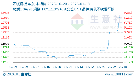 01月18日不锈钢板12941.67元/吨 5天上涨4.58%