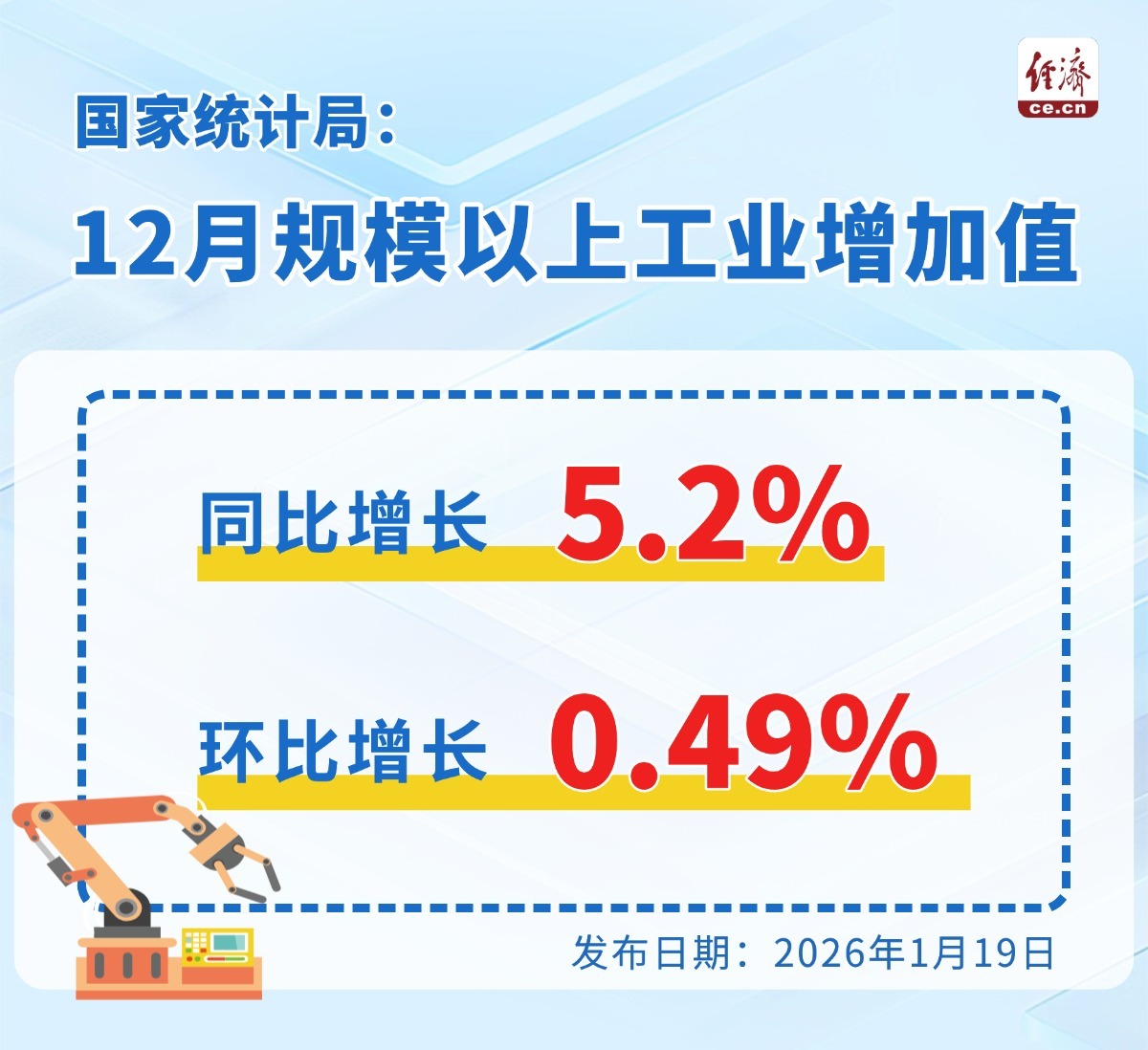 中国经济网北京1月19日讯(记者 刘芃)国家统计局今日发布数据显示,2025年12月份,规模以上工业增加值同比实际增长5.2%。从环比看,12月份,规模以上工业增加值比上月增长0.49%。