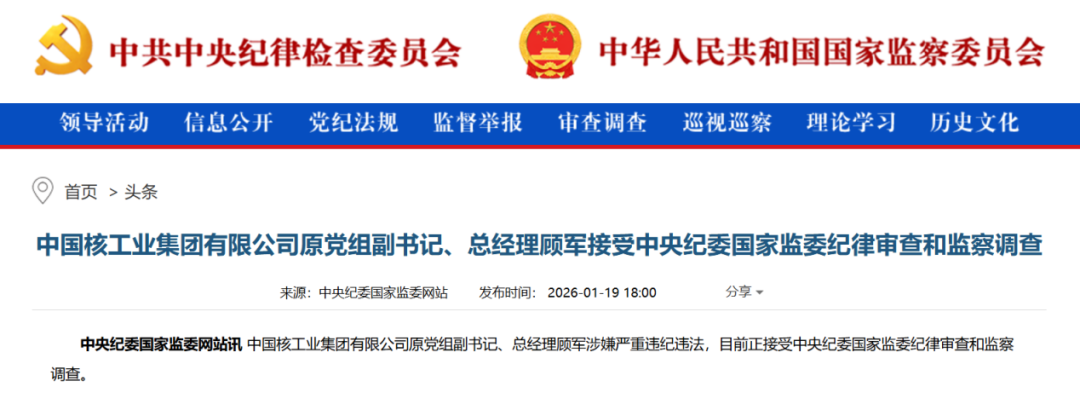 1月19日,中央纪委国家监委官网通报:中国核工业集团有限公司原党组副书记、总经理顾军涉嫌严重违纪违法,目前正接受中央纪委国家监委纪律审查和监察调查。