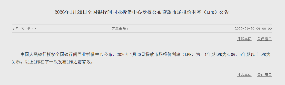 1月20日,中国人民银行发布1月贷款市场报价利率(LPR)报价,5年期以上LPR为3.5%,上月为3.5%。1年期LPR为3%,上月为3%。