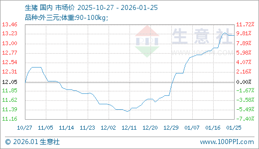 据生意社监测,生猪01月25日最新价格13.20元/公斤,最近30天上涨12.53%。