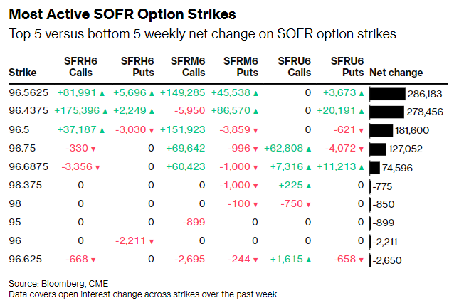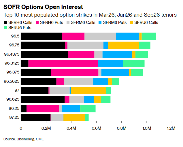 在2026年9月到期的SOFR期权中,行权价96.5625的合约新增大量风险敞口,过去一周,3月和6月到期的看涨期权交易活跃。6月到期的看跌期权在该行权价也增加了可观的风险敞口。