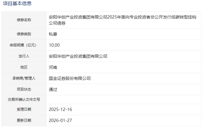 【大河财立方消息】1月28日消息,安阳华创产业投资集团有限公司2025年面向专业投资者非公开发行低碳转型挂钩公司债券项目获深交所通过。本次债券拟发行金额10亿元,承销商/管理人为国金证券(600109)。据悉,这是安阳华创产业投资集团首次发债。