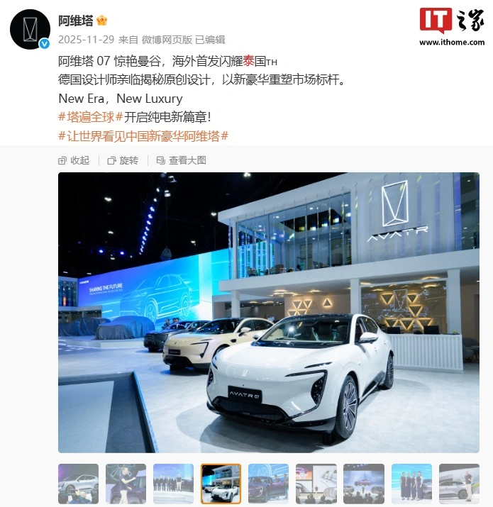 2023年11月,阿维塔携旗下双旗舰车型阿维塔11、阿维塔12首度亮相泰国,并宣布将进入东南亚(513730)汽车市场。IT之家注意到,阿维塔07已于去年11月在泰国海外首发。