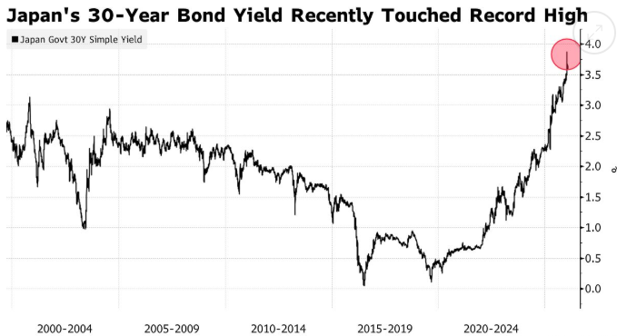日本首相高市早苗提出的降低食品消费(883434)税的计划,导致日本国债收益率上月飙升至历史新高,引发的抛售潮波及全球债券市场。尽管此后市场压力有所缓解,但日本30年期国债收益率仍接近其发行以来的最高水平。