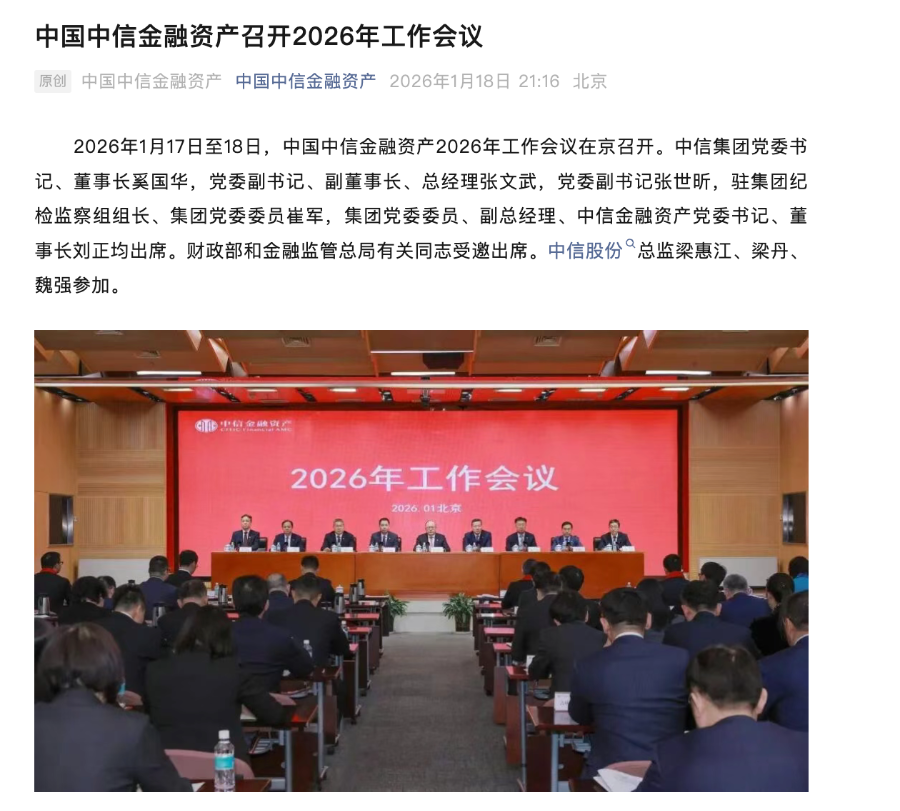 1月以来,中国长城(000066)资产管理股份有限公司、中国中信金融资产(HK2799)管理有限公司、中国东方资产管理股份有限公司、中国信达(HK1359)资产管理股份有限公司相继完成了2026年度党建和经营管理工作会议。