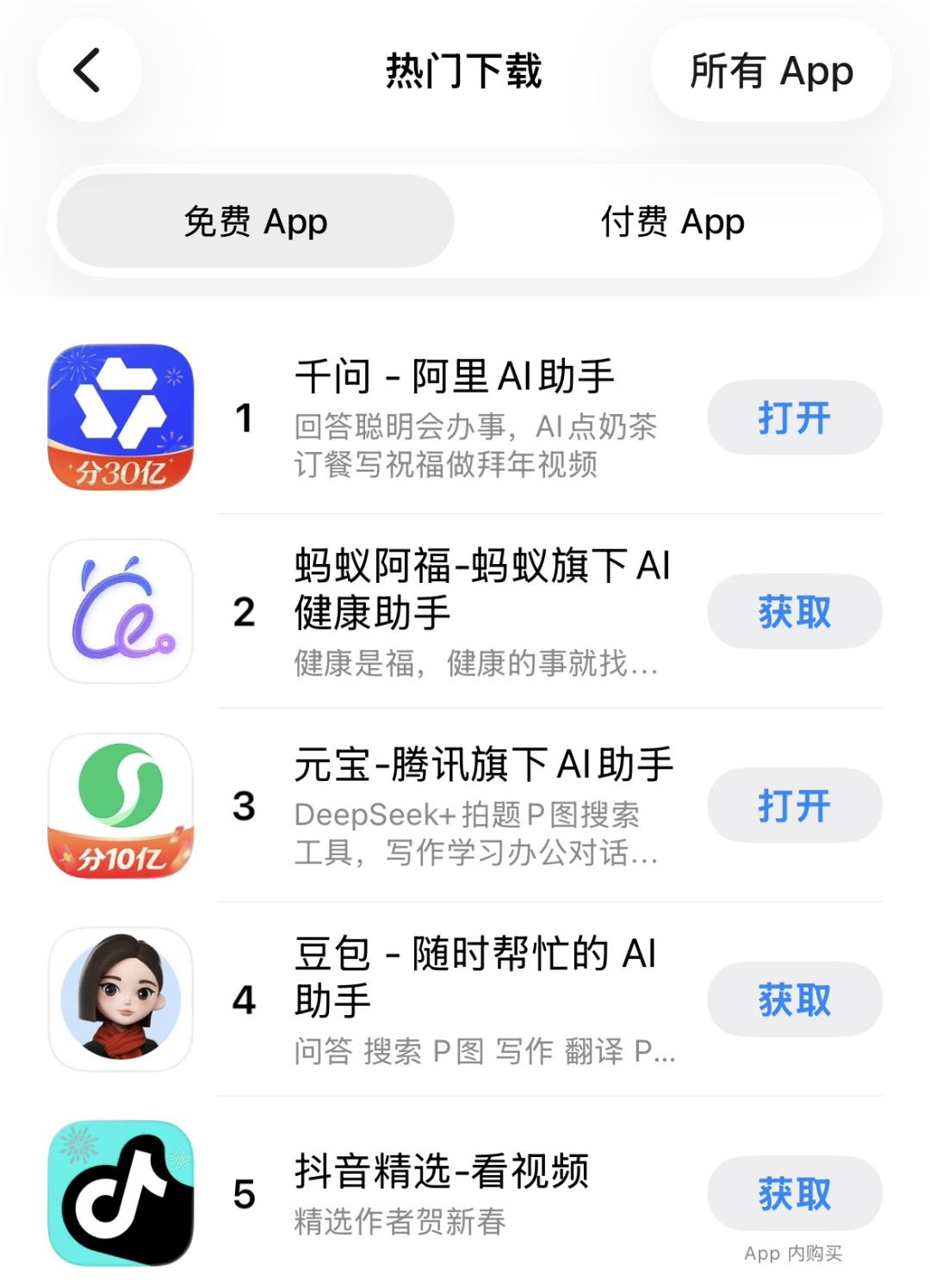 2月11日,苹果(AAPL)App Store中国区免费应用排行榜显示,千问下载量猛增,占据榜单第一。