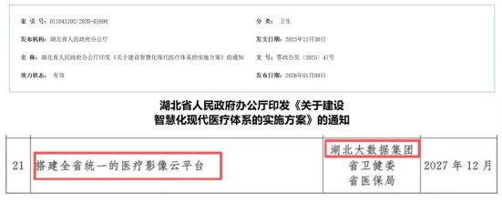 2025年12月30日,湖北省政府办公厅印发《关于建设智慧化现代医疗体系的实施方案》的通知,更加明确了重点任务:建设全省统一的“影像云”平台。