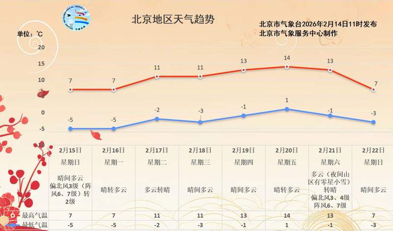 明天白天仍有三级左右偏北风,阵风六七级,预计傍晚前后风力逐渐减小停歇。在冷空气的影响下,明天气温明显下降,白天最高气温回落到7℃左右,夜间最低气温在-5℃左右。北风呼啸,气温下降,风寒效应明显,出行还请注意防风防寒。