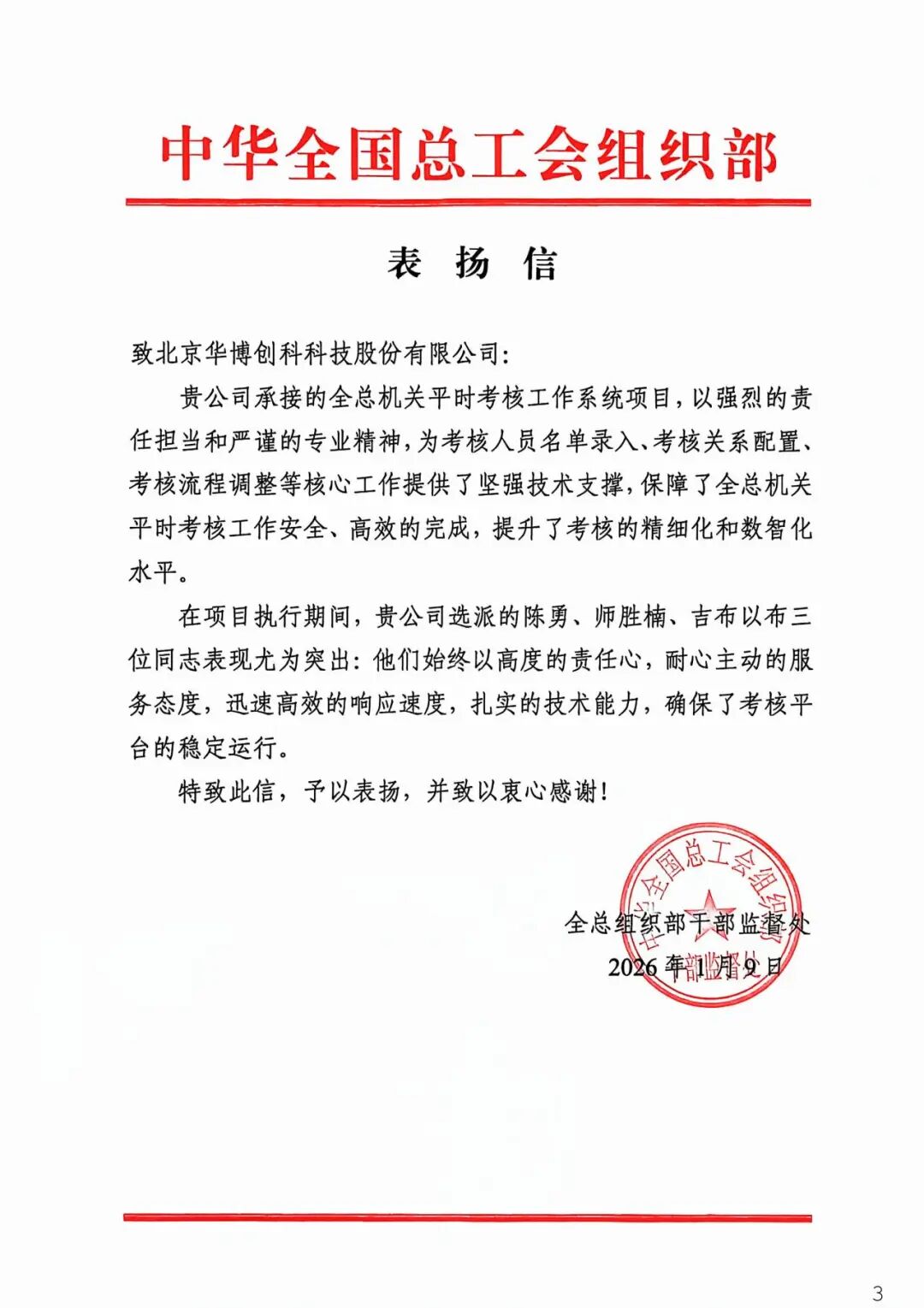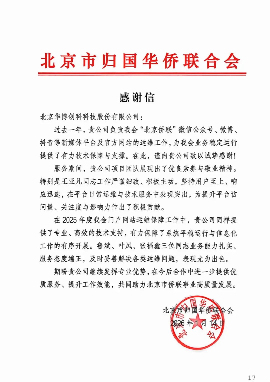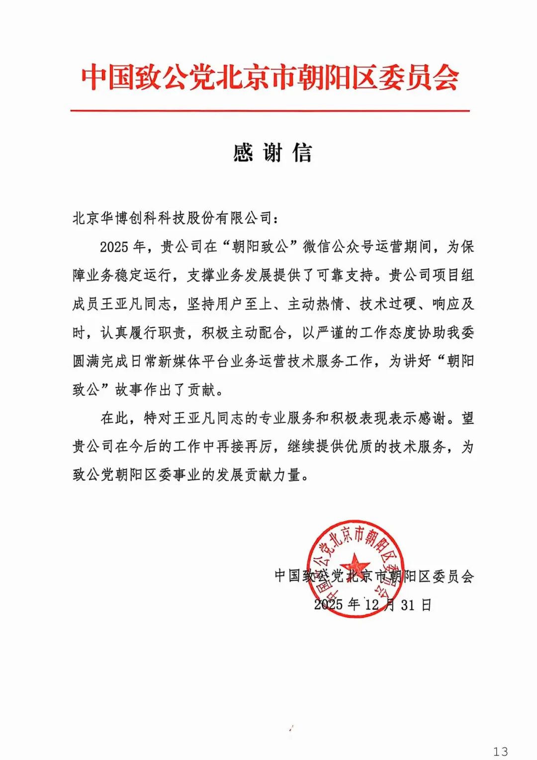 近日,北京华博创科科技股份有限公司荣获21封来自党政机关、民主党派、事业单位及社会组织的感谢信,高度肯定公司在2025年度提供的高质量技术服务与专业支持。发感谢信的单位包括: