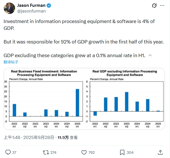 他指出,其中一个主要原因是许多AI基础设备都是进口的。尽管美国公司在这方面投入巨大,但进口芯片和硬件抵消了这些投资在GDP计算中的实际意义,因此对2025年美国GDP增长的贡献基本为零。