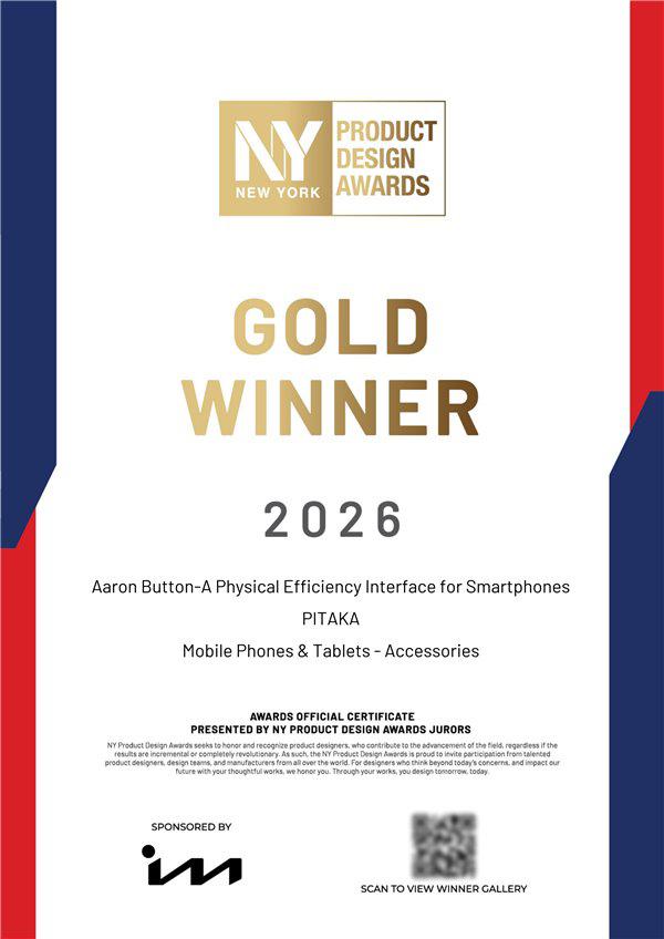凭借前瞻设计理念与人性化智能交互,Aaron Button一举斩获2026纽约产品设计奖金奖。作为全球设计领域极具影响力的权威奖项,纽约产品设计奖旨在表彰兼具实用性与美学创意、改善日常生活的卓越设计作品。Aaron Button的命名,致敬Aaron Swartz所倡导的精神——让信息自由流动,让技术真正服务于人。PITAKA以打破信息壁垒为初心,让Aaron Button成为用户无需思考的肌肉记忆,以极简交互重构操控体验,将生活与设备的掌控权交还用户手中。