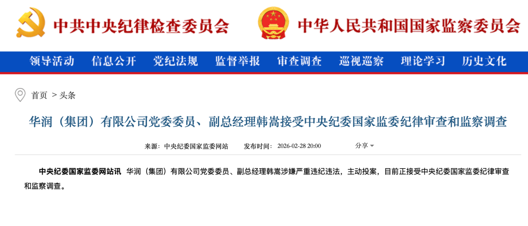 2月28日,中央纪委国家监委网站通报,华润(集团)有限公司党委委员、副总经理韩嵩涉嫌严重违纪违法,主动投案,目前正接受中央纪委国家监委纪律审查和监察调查。