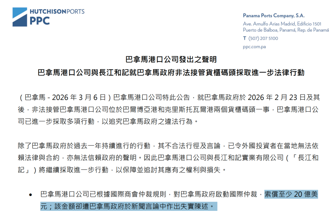 这份巴拿马当地时间2026年3月6日发布的声明还强调,PPC与长和将寸步不让,亦非仅寻求象征性补偿,而是就巴拿马政府严重违约及反投资者行为,全数追索其应得的一切权益。巴拿马港口公司与长江和记并永久保留对巴拿马政府、其代理人及任何第三方行使所有法律权利及追索权。