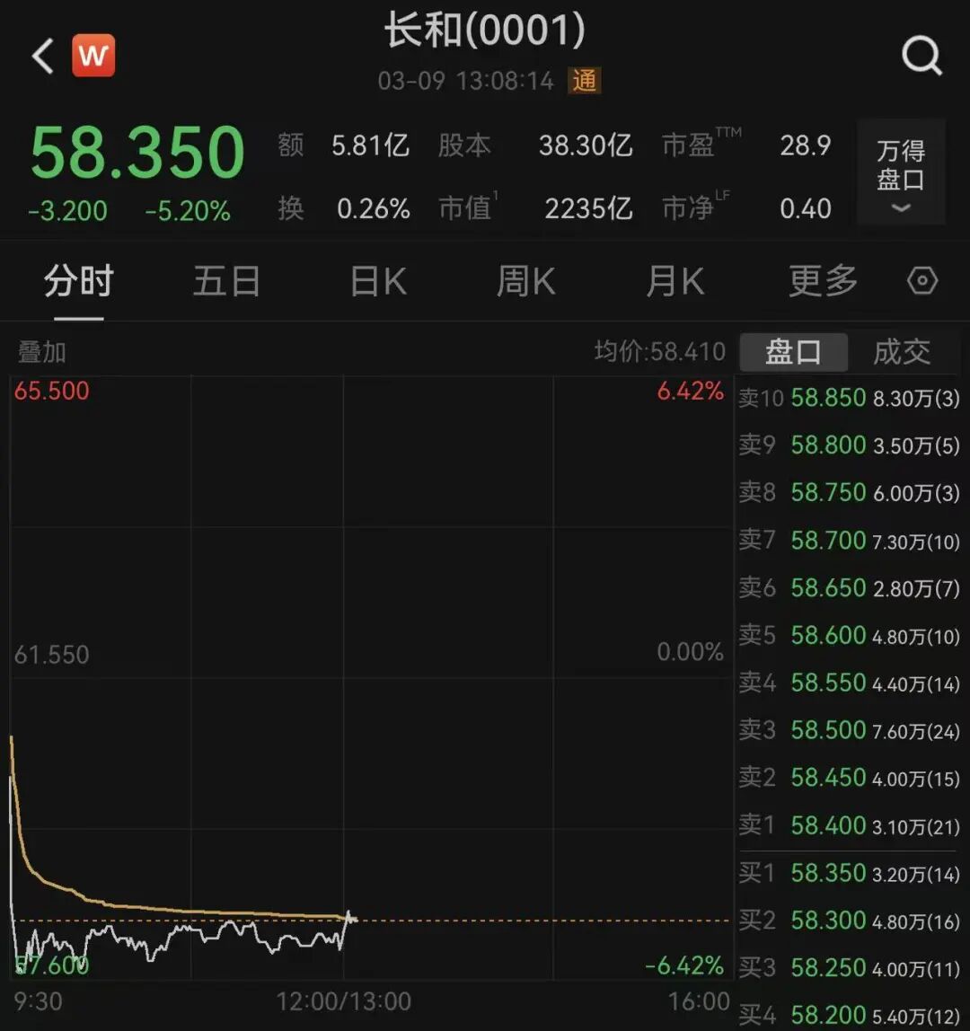 3月9日,截至发稿,长和股价跌5.2%,每股报58.35港元,总市值2235亿港元。