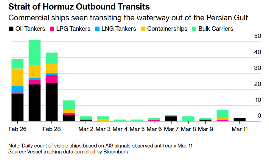 尽管偶尔仍有船只成功穿越霍尔木兹海峡,但在海上安全恢复之前,该行业的大部分运力仍滞留在海峡之内的两侧。在伊朗对美国和以色列打击进行报复、数艘商船遭导弹袭击之后,虽然伊朗官方未进行公告式封锁,但是通过该航道的交通实际上已陷入停滞。导弹和无人机(885564)活动仍对附近所有船只构成严重风险。