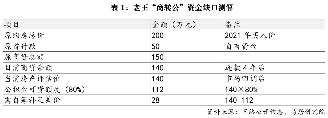 这里以一个通俗案例来解释这种困境。以购房者老王为例:2021年他以200万元总价购入一套房产,首付50万元,商业贷款150万元。经过四年还款,目前尚欠银行140万元。然而,当前该房产市场评估价已跌至140万元。按照公积金贷款“房屋现价×贷款成数(通常为80%)”的计算规则,老王最多可贷112万元,与140万元的欠款之间形成28万元的资金缺口。这意味着,老王在资产已缩水60万元的情况下,仍需一次性筹措28万元现金才能完成转贷。
