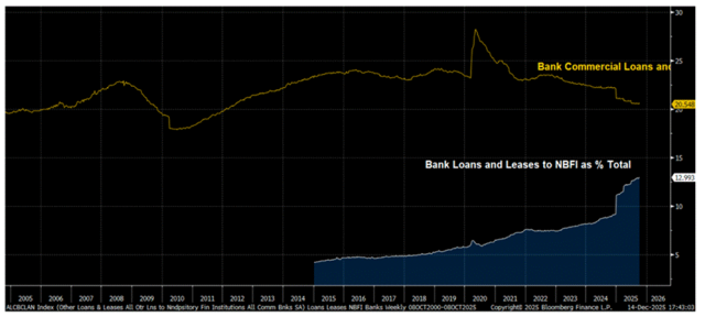 表面上看,美国的信贷扩张似乎如火如荼。正如上图所示,自特朗普2024年底的胜选以来,美国银行(BAC)业的总贷款同比增速正在陡峭攀升,一路逼近6.0%的高位。在25年12月和26年1月,银行总资产分别增长了7.1%和8.1%。2026年1月,美国大型国内特许商业银行的贷款和租赁年化增长率更是达到了9.7%。2025年以来,美国银行(BAC)业的净利息收入增速(NII,蓝线)也随着贷款增速(灰线)的抬头而上行。
