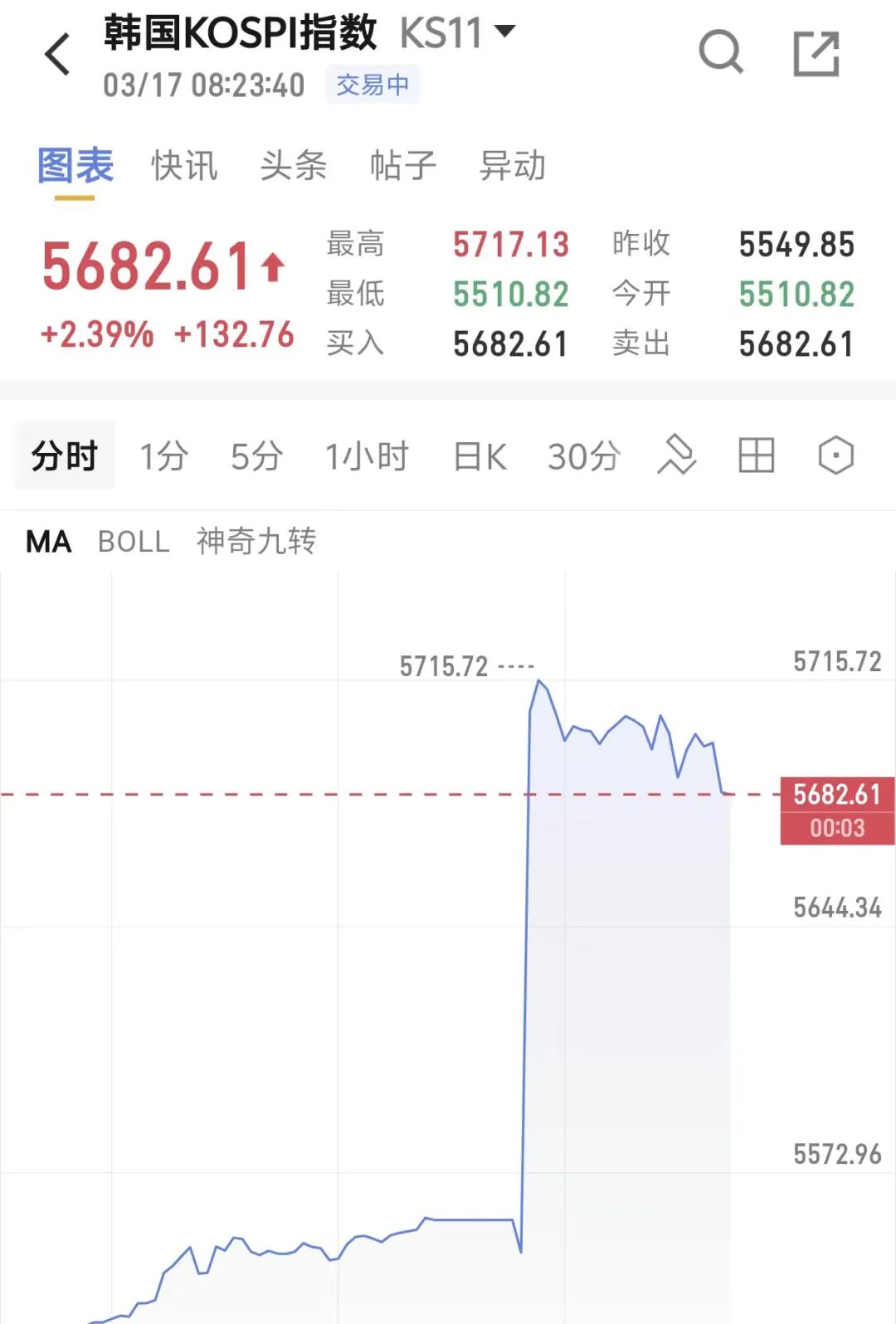 3月17日,日韩股市高开。日经225(N225)指数开盘大涨,截至发稿涨幅扩大至1%,涨幅超600点,报54355.76点。韩国kospi(KS11)指数开盘上涨152.92点,涨幅2.76%,报5702.77点,截至发稿涨幅收窄至2.39%。